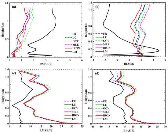 After testing, the maximum number of iterations was set to 7, and the fixed regularization factor was set to 10,000 for temperature profile retrieval and 100,000 for humidity profile retrieval in each iteration. The retrieval reaches convergence when the following criteria are fulfilled, as shown in Equations (5) and (6) [19].