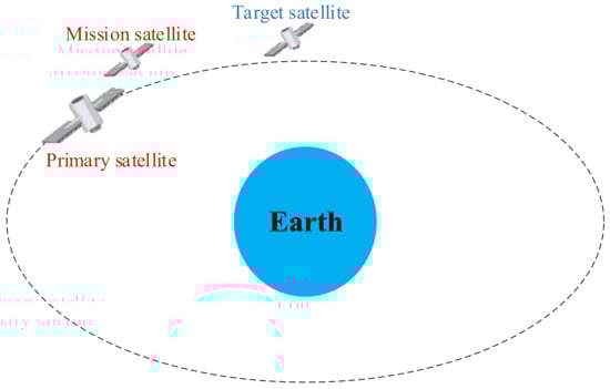 High-value primary satellites and their supporting mission satellites are distributed in geosynchronous Earth orbit. A satellite with an unknown purpose (target satellite) has appeared near the primary satellite, as illustrated in Figure 1.
