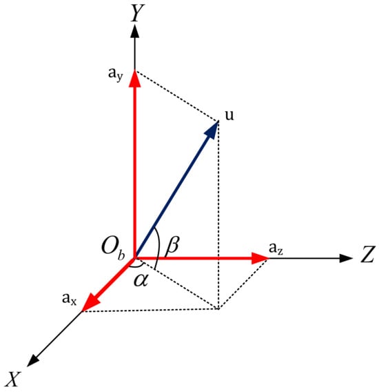 Define as the angle between and the plane, and the angle between its projection onto the plane and the -axis is . The components of along the three axes of can be expressed as follows: