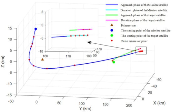 The motion trajectories of the mission satellite and the target satellite in the primary satellite’s coordinate system are shown in Figure 5. It can be seen that both the mission satellite and the target satellite performed multiple impulse maneuvers to adjust their trajectories. The mission satellite aimed to transfer to the capture area of the target satellite by adjusting its trajectory and remain in this area for a sufficient duration to effectively suppress the target satellite. In contrast, the target satellite adopted an evasion strategy, using impulse maneuvers to avoid the approach of the mission satellite as much as possible. The frequent impulse control of the mission satellite during the sustained phase successfully compensated for the trajectory deviation caused by the target satellite’s evasion maneuvers, ensuring that the target satellite remained within the capture area and preventing its escape. This fully demonstrated the initiative and flexibility of both sides in their control strategies.