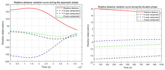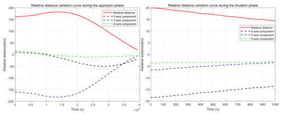 The primary satellite is located in an orbit 36,000 km above the Earth’s surface. The orbital parameters are as follows: semi-major axis of 42,378 km, eccentricity of 0, orbital inclination of 40 degrees, right ascension of ascending node of 20 degrees, argument of perigee of 0 degrees, and true anomaly of 87 degrees. In the orbital coordinate system, the relative distances and relative velocities between the mission satellite, the target satellite, and the primary satellite are shown in Table 1.