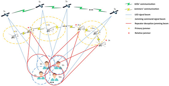 Each primary jammer plays the game several times, with the help of a pseudo-random algorithm, to filter out the optimal set of relative jammer strategies under the Nash equilibrium. The primary jammer receives the LEO signals from the area to be jammed and processes the signals, including down-conversion, code stream extraction, etc., modulates them into a special frequency band, and broadcasts them to the relative jammers. The relative jammers receive the jamming command and jamming LEO information from the primary jammers, adds time delay and up-conversion to the signal, and then broadcasts it to the jamming target through the directional antenna to complete the jamming of the jamming target.
