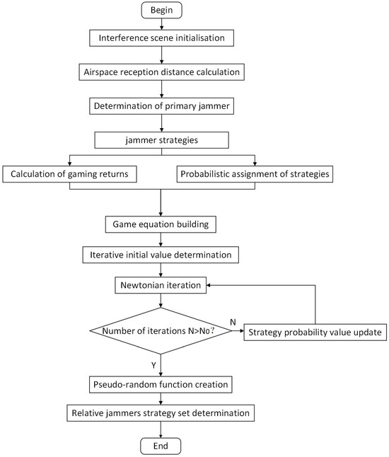 In order to optimise the jamming effectiveness, multi-dimensional strategies in the air, time, frequency, and power domains need to be considered to ensure that multiple jammers can achieve efficient co-operation. Figure 2 represents the block diagram of the distributed interference optimisation algorithm flow. In the spatial domain, dynamic determination of the primary and relative jammers is achieved by calculating the minimum reception distance of the corresponding LEO satellite. The primary jammers perform a hybrid decision game to determine the set of secondary jamming source strategies to be used for relaying LEO satellite jamming signals. The multi-dimensional information optimisation method is used to construct the strategy payoff function by combining information from the time, frequency, and power domains. Assigning an unknown probability to each strategy, such that the expected payoffs from all primary sources of interference are equal, constructs the game equation. The equation is solved with the help of the mathematical iterative method to obtain the probability value of the strategy when the number of iterations is greater than . This strategy probability corresponds to a Nash equilibrium point. The pseudo-random algorithm is constructed by strategy probability.