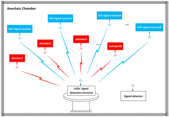 As shown in Figure 4, the simulation uses GIS to establish a low-orbit megastar seat interference countermeasure scenario, with a large microwave darkroom as the interference verification scenario. Figure 5 represents the equipment layout. Highly dynamic LEO satellite constellations show different distributions over time. A number of jammers are distributed at a certain height above the area to be disturbed. All distributed jammers can communicate with other distributed jammers, and an LEO signal receiving terminal is placed at the centre of the jamming area.