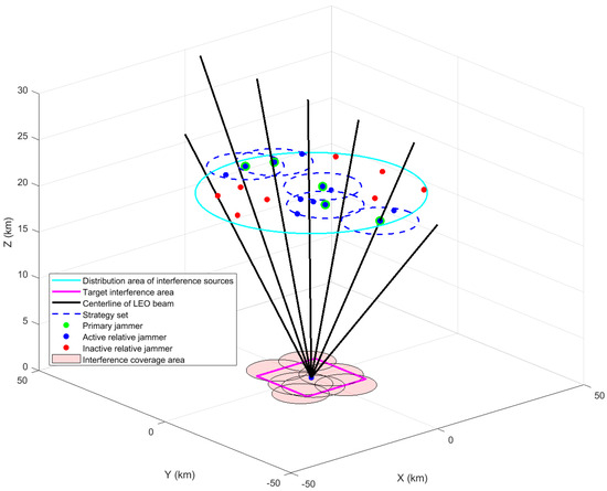 Optimisation for distributed jammer deployment not only improves jamming effectiveness but also reduces unnecessary losses. In [36], the problem of targeted allocation of weapon targets for air defence operations was solved using dynamic programming. In [37], the nonlinear combinatorial optimisation problem for the dynamic combination of weapon resources and objective matching on different platforms is solved using the 0–1 integer programming method. However, in the face of a large number of distributed interference sources, a variety of interference targets, and rapid changes in the dynamics of LEO satellites, it is often difficult for such exact algorithms to quickly converge to an exact solution. Besides some exact algorithms, heuristic algorithms are often used for distributed optimisation problems. In [38], a jammer optimisation method based on the Pelican optimisation algorithm is proposed, but the method is prone to fall into local optima. In [39], an artificial bee colony-based jammer allocation algorithm is proposed, but the method is sensitive to the relevant parameter settings, and the accuracy of the results is limited. In [40], a fusion algorithm based on Ant Colony and Q-Learning (Ant-QL), which does not rely on a priori information and enhances adaptability through real-time interaction between the jammer and the target radar, is proposed, but the method has a slow convergence speed, which is not able to meet the real-time requirements on the battlefield. In [41], an evolutionary reinforcement learning-based collaborative jamming resource allocation method is proposed, which uses joint multi-domain information to accomplish the optimisation of the joint allocation of jamming beams and jamming power under the constraint of jamming resources. In [42], a two-stage approach based on cooperative game theory is proposed to efficiently determine the optimal location and size of distributed energy sources to maximise their potential benefits. In [43], a multi-objective microgrid optimal arithmetic problem with different equations and inequality constraints is presented, and the optimisation of this distributed system is carried out using cooperative games. Currently, there are fewer studies on distributed interference optimisation problems using game-based approaches, and this study conducts a related study to fill this gap.