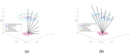 Set of distributed interference source strategies in different scenarios. (a) Set of distributed interference source strategies at moment t1. (b) Set of distributed interference source strategies at moment t2.
