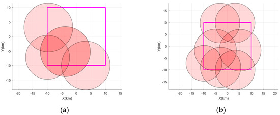 The regional interference coverage for the two scenarios. (a) The regional coverage of the landing field by the distributed jamming source at the moment t1, when the game has not converged and (b) the regional coverage of the landing field at the moment t2, when the distributed jamming source game converges.