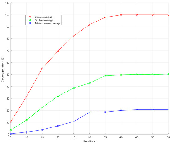 As can be seen in Figure 9, this topology is able to converge in terms of time-averaged coverage of the interference region after using the proposed optimisation method. The one-fold coverage converges to 100%; the two-fold coverage converges to 50.3588%; and the three-fold and above coverage finally converges to 20.7062%. This result shows that the interfering signal can effectively achieve full coverage in the whole domain range and can use less optimisation time to complete the stable coverage effect, which improves the interfering efficiency.