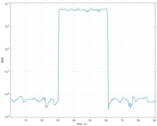Figure 10 represents the variation curve of the BER of the jamming target receiver during the process of the jammers going from off to on to off. When the jammers are not turned on, the BER is on the order of , indicating that the system is able to achieve normal communication and positioning. When the jammers are turned on, the BER is stably distributed between and . Effective jamming is achieved, and the quality of the communication link decreases significantly. In the absence of jamming, the signal receiver receives a signal with a BER mean of , a sample standard deviation of , and an overall standard deviation of . This demonstrates that more stable communication and data transmission can be accomplished between the analogue source and the signal receiver of the LEO star when no interference is carried out. When jamming is performed, the signal receiver receives a signal with a BER mean of , a sample standard deviation of and an overall standard deviation of . This demonstrates the effectiveness and high success rate of jamming while enabling stable jamming.