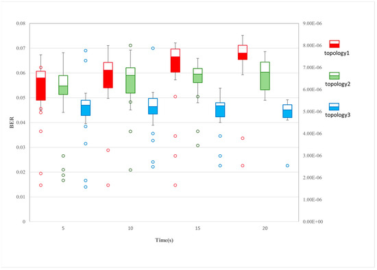 As shown in Figure 11, the boxplots record the BERs for 100 experiments for three different topologies, with jamming implemented for 5 s, 10 s, 15 s, and 20 s. The red, green, and blue boxes represent data for topologies 1, 2, and 3, respectively. The tight distribution of the upper and lower edges of the box-and-line plots shows that the jamming system maintains decision stability even when the distributed jammers are presented with different topologies. This provides some technical guarantee for the future realisation of highly dynamic airborne jammers. The nonlinear growth of the median line in the box with the times indicates that the system has a certain perception capability. Under the premise of ensuring interference stability, the system implements progressive interference regulation through dynamic parameter optimisation and strategy iteration mechanisms, which ultimately achieve a stepwise increase in interference effect. This adaptive regulation not only maintains the basic stability of the suppression effect but also achieves a cumulative enhancement in the interference gains through continuous strategy evolution. The hollow circles are the singular values appearing in the box plots, and the axes are on the right side, indicating the number of unsuccessful interference realisations. It can be seen that as the jamming time increases, the singular values become less and the jamming success rate increases.
