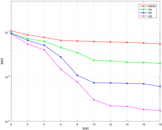 In this study, the BER variation rule with the signal-to-noise ratio (SNR) of the four optimisation methods is demonstrated in Figure 13 under the scenario that the forwarded interference signal intrudes into the receiver. The experimental results show that in the low SNR region (SNR < 8 dB), the system BER is mainly dominated by the environmental noise, and at this time, the performance difference between the anti-jamming algorithms does not show significant differentiation. When the SNR is increased to more than 10 dB, the influence of environmental noise shows an exponential decay trend. At this time, the forwarding interference signal becomes the core factor restricting the BER, and the performance difference of the algorithms starts to appear significantly. The retransmitted interference signal can break through the limitation of the traditional filter and penetrate into the demodulation module at the receiver. It is worth noting that the optimisation algorithm proposed in this study shows a significant advantage in the 12–18 dB high SNR interval, which can control the BER stably at , while the GD algorithm has a lower BER in this interval, which verifies its lack of interference capability.