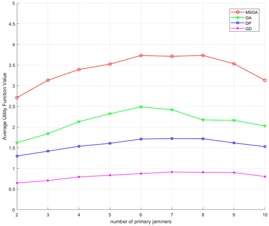 Figure 14 shows the values of the interference mean utility function under different optimisation methods. It can be seen that the interference mean utility functions of all the methods show a tendency of increasing and then decreasing. This phenomenon can be attributed to the effect of the variation in the number of primary jammers on the interference gains. As the number of primary jammers increases, the jamming gain increases significantly. Due to the constant number of total jammers, when the primary jammers account for a large proportion, the number of available relative jammers decreases accordingly, which forces some of the primary jammers to have to choose the relative jammers with lower gains, which leads to a decrease in the overall utility value. From the utility function point of view, the utility function values of the algorithms in this paper are higher than the other three methods for different numbers of primary jammers. Compared to the GA algorithm, the utility function value of the proposed algorithm in this paper is improved by a maximum of 0.7187 times when the number of primary jammers is 8, and a minimum of 0.4993 times when the number of primary jammers is 6. Compared to the DP algorithm, the utility function value of the proposed algorithm in this paper is improved by a maximum of 1.2110 times when the number of primary jammers is 4, and a minimum of 1.0502 times when the number of primary jammers is 10. Compared to the GD algorithm, the proposed algorithm in this paper improves the utility function value by a maximum of 3.4386 times when the number of primary jammers is 3, and a minimum of 2.8927 times when the number of primary jammers is 10.