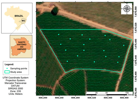 Located in the municipality of Santo Antônio do Amparo, Minas Gerais, Brazil, the study area consists of a coffee plantation (Coffea arabica L.) established in December 2016, covering an area of 2.10 hectares. The crop was planted with a spacing of 3.50 m between rows and 0.50 m between plants, using the Mundo Novo Vermelho (IAC 379/19) cultivar, according to the National Cultivar Registry (Registro Nacional de Cultivares—RNC) of the Ministry of Agriculture, Livestock, and Supply (Ministério da Agricultura, Pecuária e Abastecimento—Mapa) (Figure 1).