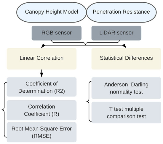 Subsequently, statistical differences between the estimated plant heights from the RGB and LiDAR sensors were analyzed. Initially, data normality was assessed using the Anderson–Darling statistical test. After confirming data normality, the Tukey multiple comparison test at a 5% probability level was applied.