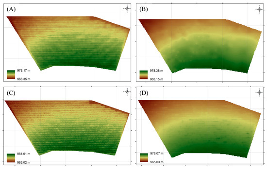 DSM obtained by the (A) RGB and (C) LiDAR sensor; DTM obtained by the (B) RGB and (D) LiDAR sensor.
