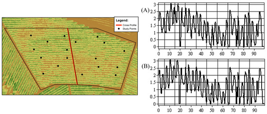The CHMs for the two study sensors are presented in Figure 5. The sampling points were based on the definition presented by Bento et al. [19], considering different height zones of the plants, a fact also observed in the CHMs generated in this study. High-plant zones are highlighted with height values ranging from 2.50 to 3.50 m, and low-plant zones with values ranging from 1.50 to 2.50 m in height. The cross-sectional profile with plant height information obtained by the comparative CHM for the two study sensors is presented in Figure 6, also showing a close resemblance between the obtained results.