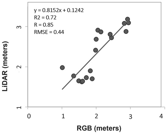 In terms of evaluation, the results of precision metrics for the study sensors show good agreement (R2 = 0.72, R = 0.85, and RMSE = 0.44 m). It is worth noting that LiDAR scanning and RGB photogrammetry can be collected simultaneously via RPAs, allowing for the integration of both approaches in capturing and generating datasets with information for reconstructing structural information of agricultural areas. However, the method of estimating plant height by RGB sensor is also capable of achieving a high level of precision and has time and cost efficiency compared to the method of estimating plant height by LiDAR sensor.