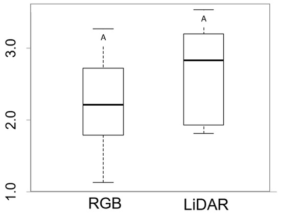 The estimates of the spatial distribution indirectly between plant height and soil penetration resistance (MPa) are presented in Figure 9 for the two study sensors (Figure 9A) RGB and (Figure 9B) LiDAR. The values of the statistical metrics for accuracy assessment between the two study sensors were 0.87 for R2, 0.83 for R, and 0.14 m for RMSE (Figure 9), with no significant statistical differences determined by the Tukey test at a 5% probability level (Figure 10).