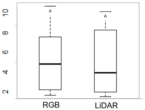 Based on the exploratory data analysis (Table 2), close agreement was observed between the coffee plant height data obtained from the two sensors under study. However, the statistical differences by mean test via boxplot analysis for the plant height variable are presented in Figure 6, highlighting that no significant statistical differences were determined by the Tukey test at a 5% probability level (Figure 8).