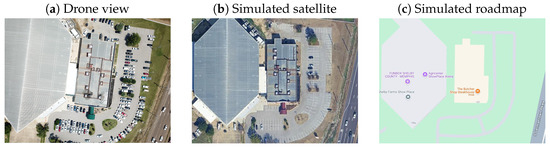 Developing robust machine learning models for aerial imagery applications requires access to large, diverse datasets that ensure both accuracy and generalization [34]. TerrAInav Sim (https://github.com/JacobsSensorLab/TerrAInav-Sim, accessed on 9 April 2025) addresses these needs by providing synthetic aerial datasets that can be used for data augmentation, making it a valuable resource when labeled data are scarce or costly to obtain. This lightweight, versatile tool captures geotagged, simulated aerial images, emulating a UAV capturing bird’s-eye view map-based images with real-world visible-band specifications. By default, the simulated drone is positioned at a zero yaw, facing north, with a 90-degree tilt (looking straight down), as shown in Figure 1. While this orientation is limited to a top-down perspective, it aligns well with many applications that rely on bird’s-eye views for analysis. Through TerrAInav Sim, users can simulate diverse missions by specifying coordinates for any global location using Python 3.10. Additionally, for users with the means to collect their own drone-view images, TerrAInav extends the capabilities of the University1652 dataset to any region, enabling tasks that integrate both drone-view and satellite-view images for enhanced data collection and analysis.