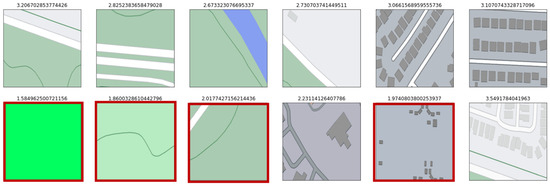 The same images as in Figure 6 in roadmap mode. In the roadmap, it is easier to detect a lack of significant features, as marked in red. The entropy of each image is marked on top of it.