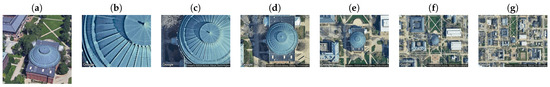 TerrAInav Sim image capture comparison (b–d) with a sample collected by [13] at 40.10594310015922, −88.22728640012006 (a). The number above each image indicates the captured in meters. All the images were captured with a fov of 78.8 and an aspect ratio of 4:3. (a) 23.8, [13]; (b) 15; (c) 30; (d) 60; (e) 120; (f) 250; (g) 500.