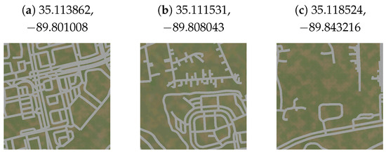 Sample data generated using TerrAInav Sim are available in the ’dataset’ folder. The main dataset, Agricenter dataset, includes raster images of the Memphis Agricenter Area (Figure 8) covering the rectangular bound between the top left coordinates of and the bottom right coordinates of . The simulation uses a UAV-based camera with a of 78.8 degrees, an of 4:3, and a fixed of 120 m. There are two sets of 1806 images each in “satellite” and “roadmap” modes without any overlap. These data are placed in the “Memphis” folder under two subfolders, “satellite” and “roadmap”, specifically designed to be used for machine learning tasks. For ease of access, the images are geotagged; the metadata table contains image names, column and row indices of the raster search, central coordinates of each image, and the zoom level value for each image (“Alt”). A larger dataset generated by TerraAInav Sim from the Memphis area helped with the image feature extraction described in [27]. Some corresponding ML processes will be explained as follows. Figure 9 represents the customizability of the TerrAInav dataset compared to an open-access dataset introduced earlier. In this example, a take-off mission was simulated from the rooftop of the Foellinger Auditorium, University of Illinois Urbana-Champaign, to an altitude of 500 meters.