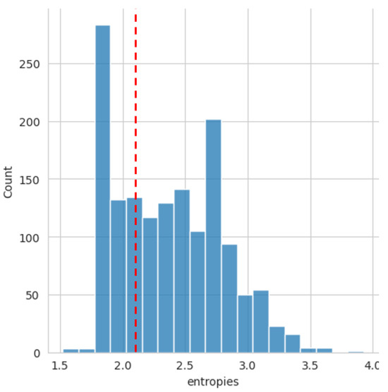 Histogram of image entropies with the red line marking the 2.1 threshold. As shown, a significant portion of data falls below this threshold, but these samples mostly consist of unremarkable features, like green areas with trees and farms. Discarding them is ideal, as the majority of valuable data remains safely above the threshold.