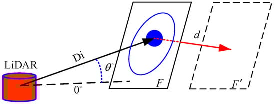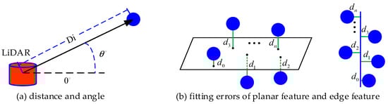 According to the LiDAR point cloud data collection mechanism, we intuitively assume that the influencing factors of measurement error may include the distance and angle of the laser reflection point from the LiDAR center, as well as the extracted feature accuracy. The detailed meanings of these factors are shown in Figure 2.