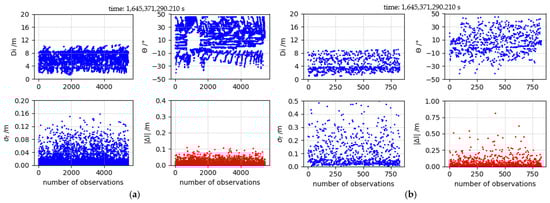 In Section 3, we compared the effects of distance, angle, and feature accuracy on the actual measurement errors under different LiDAR specifications, different point cloud scanning densities, different prior maps, and different urban road scenes. From the results of these comparative experiments, it can be seen that the feature accuracy factor has a dominant influence on the actual measurement errors, while the influence of distance and angle factors is not particularly significant. Generally, the lower the feature accuracy, the greater the actual measurement error. Through the use of the relationship between feature accuracy and actual measurement error, a random error model of the corresponding observation vector can be constructed to improve the accuracy of parameter estimation.