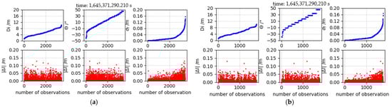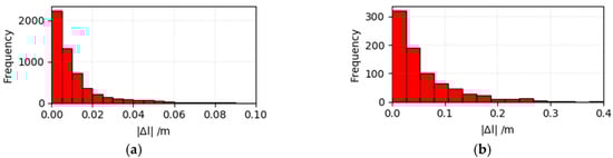 Figure 4a shows the distances , angles , feature accuracies , and actual measurement errors corresponding to planar features, and Figure 4b shows those for edge features. It can be seen that the distances and angles are evenly and discretely distributed, the number of observations corresponding to planar features is significantly greater than that corresponding to edge features, and the feature accuracies and actual measurement errors are relatively smaller than those of edge features. Furthermore, histograms of the actual measurement errors corresponding to the planar features and edge features are plotted as shown in Figure 5.