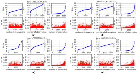 Before extracting point cloud features, if the LiDAR is moving to obtain the point cloud data, the self-motion distortion of each point needs to be calibrated in advance with the help of the INS or other prior pose information [39]. Otherwise, self-motion distortion of up to 0.5 m will greatly reduce the accuracy of the LiDAR point cloud coordinates [40]. This self-motion distortion is similar to the atmospheric delay error in each pseudo-range measurement of the GNSS. Before analyzing the measurement error of the pseudo-range positioning model, it is necessary to correct or eliminate the atmospheric error by using methods such as a zero baseline or ultra-short baseline to avoid interfering with the measurement error analysis. Therefore, the analysis of measurement errors in LiDAR point cloud feature matching and positioning should be similar. In addition, it should be noted that in real LiDAR matching positioning, there are various incentive errors caused by special circumstances, such as the linearization error of the positioning model caused by an inaccurate initial pose, error caused by the vibration or impact of the carrier, error caused by interference from other light sources or mirror reflection, error caused by spatiotemporal changes in the scene map (moving objects, rainy and/or snowy weather, seasonal changes in green plants and/or tree trunks) [41,42,43], etc. Most of the measurements containing these incentive errors are classified as outliers in survey adjustments. For the analysis of random measurement errors, it is inappropriate to consider errors caused by special conditions, and if all these excitation errors are taken into consideration, then such an error model will inevitably be complex and difficult to model practically. So, the outliers can be eliminated by applying the commonly used principle of taking three times the standard deviation as the limit error, or by using the famous Detection, Identification, and Adaptation (DIA) algorithm proposed by Teunissen in the GNSS field [44,45]. Therefore, this paper focuses on analyzing the main influencing factors of a random error model that describes the measurement accuracy characteristics in the point cloud feature matching positioning model (2), so as to provide guiding support for establishing a practical basic random measurement error model.