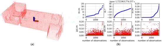 where is the variance–covariance matrix of the measurements. is the measurement vector obtained by the distance from the point to the associated feature. is a priori variance factor, is the cofactor factor, and is the design matrix obtained by taking the partial derivative of (1). is the vector of residual error of the estimated pose parameter . If the pose parameter is known accurately, the actual measurement error can be obtained: