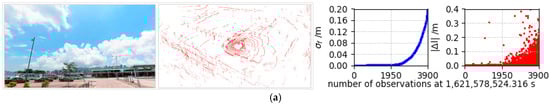 Figure 6 shows how the actual measurement errors of Ouster OS0-128, Ouster OS1-64, Robosense Helios-32, and Velodyne VLP-16 change as the distance, angle, and feature accuracy values increase. For example, Figure 4a can be transformed into Figure 6a after gradually increasing the values of the influencing factors. In Figure 6a, as the distance increases, the corresponding actual measurement error (the second row and first column of Figure 6a) does not show a significant trend change. And the performance of the angle factor is similar to that of the distance factor. However, as the value of feature accuracy gradually increases, the actual measurement error shows a significant trend change, which means that feature accuracy has a significant dominant influence on the actual measurement error. The remaining three sub-graphs in Figure 6 also show similar performance, even though the specifications of the sensors are not consistent. Note that Figure 6a,b,d are all in the same scene, that is, the scene shown in Figure 3a. Figure 6c belongs to the scene shown in Figure 3b, but the extracted feature accuracies still play a dominant role in the actual measurement errors. Through a comparison of the number of observations in Figure 6a,b,d, it can be found that the sensor specifications are mainly related to the number of observations and have no significant impact on the actual measurement errors.