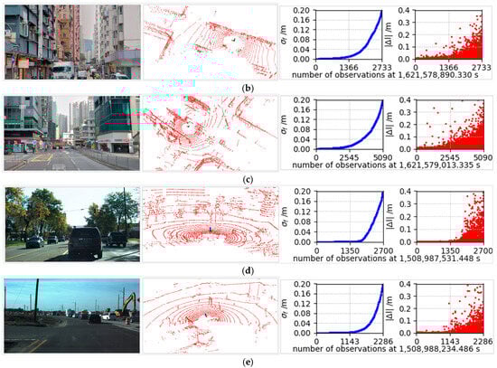 In Section 3.1, two different scenes were used to conduct verification experiments, but these were both indoor scenes. In order to analyze the consistency of the experimental results in common outdoor road scenes, we selected multiple typical scenes from public experimental data, using the same sensor to conduct comparative experiments. The specifications of the sensor are shown in Table 2. The selected scenes include an open square, a narrow street, an intersection with dense buildings, a highway with shrubs, and a traffic intersection with scattered poles. They are from the public Hong Kong UrbanNav Dataset and the Ford Multi-AV Seasonal Dataset [47,48]. The detailed experimental results are shown in Figure 9.