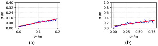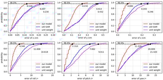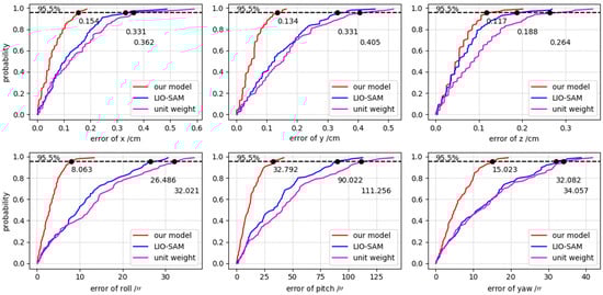 As shown in Figure 10, the standard deviations (blue dots) of the actual measurement errors and the feature accuracies show an approximately linear relationship, which also proves the important influence of feature accuracies on the actual measurement errors. In order to establish a simple and practical fitting model, we directly used the straight line equation for fitting, represented by the red straight line in the figure. Therefore, the diagonal element of the cofactor factor shown in Table 3 could be obtained. The a priori variance factor m. Next, we set up an experimental group in which our model was applied, an experimental group where was the unit matrix, and an experimental group where the Q matrix was set to be consistent with the classic LIO-SAM algorithm for positioning solution analysis. The cumulative distributions of the estimation errors of this dataset are shown in Figure 11.