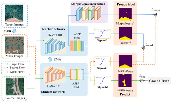 Aiming to solve the problems of insufficient utilization of context information in the target domain and incomplete characterization of landslide morphology in current landslide extraction methods, this study proposes an unsupervised cross-domain landslide extraction framework integrating an image mask and morphological information enhancement. The proposed framework comprises two core modules: (1) an image mask module and (2) a morphological information extraction and optimization module. The methodology operates through a dual-model architecture: complete target domain images are processed by a teacher model to generate pseudo-labels, while randomly masked versions of these images are fed into a student model. The student model is constrained to produce predictions consistent with the teacher-generated pseudo-labels, thereby enhancing its capacity to leverage contextual information from partially obscured inputs. This contextual learning capability is subsequently transferred to the teacher model through exponential moving average (EMA) parameter updates. Furthermore, the morphological information enhancement module analyzes target domain imagery to derive landslide morphological characteristics which are transformed into morphological pseudo-labels. These pseudo-labels guide the student model in learning comprehensive landslide morphological features. The overall architecture of the proposed framework is illustrated in Figure 1.