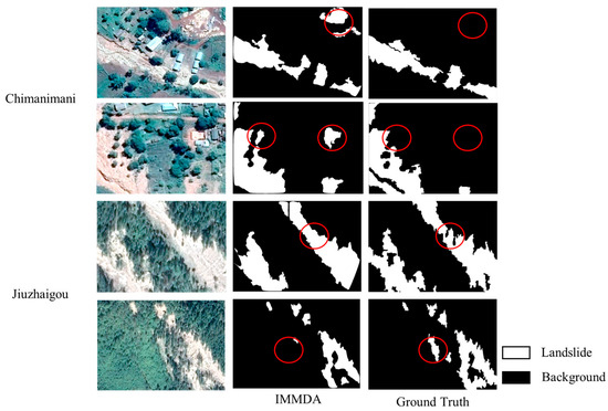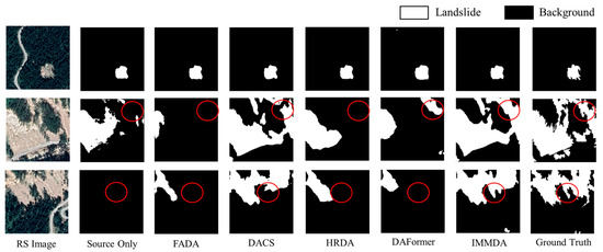 The quantitative evaluation results for different domain adaptation models in the Chimanimani region, as shown in Table 3, indicate that IMMDA achieves the highest F1-Score of 64.70% and the highest IoU of 47.82%, representing an improvement of 31.79% compared to the use of source domain data alone. The second best model, DAFormer, achieves an IoU of 41.8%. Chimanimani proves to be a more challenging target domain, with an IoU of only 16.03% when no domain adaptation strategy is applied. Despite this, IMMDA significantly improves recognition accuracy, highlighting the adaptability of the IMMDA approach to various regions and tasks. DACS, in comparison, achieves an IoU of 38.09%. When applied to the Chimanimani region, the effectiveness of DACS’s cross-domain hybrid sampling strategy is lower than in Jiuzhaigou. This can be attributed to the increased complexity of the Chimanimani remote sensing imagery, where landslides and vegetation exhibit a wide variety of color and texture characteristics. This results in greater inter-domain differences and highlights the limitations of the source domain dataset in effectively addressing such challenges.