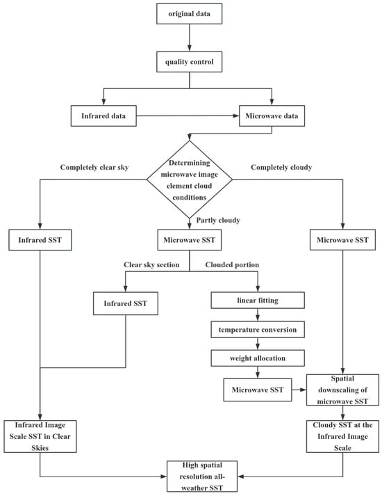 The methodology for the fusion of SST data is divided into two main parts. The first part is the quality control of the raw data to ensure that the data used have sufficient accuracy and reliability. The second part is based on the cloud conditions of the microwave image elements. According to the different situations in terms of cloud conditions, including completely clear skies, partially cloudy and completely cloudy, the corresponding processing methods are adopted, and the flow chart is shown in Figure 1.