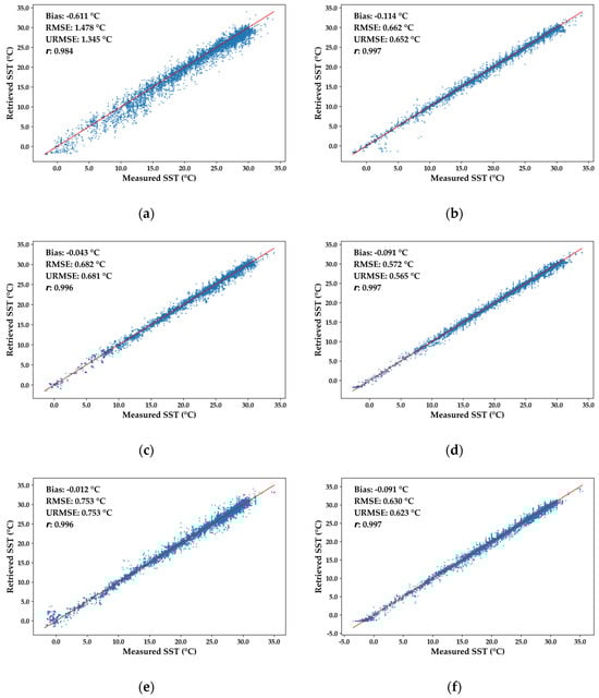 Scatter plot of three fusion products and OISST reference data matched with measured data: (a) is the result after the fusion of VIRR and MWRI data; (b) is the OISST reference data for 15 July 2019, corresponding to VIRR and MWRI data; (c) is the result after the fusion of AVHRR and AMSR data; (d) is the OISST reference data for 15 October 2023, corresponding to AVHRR and AMSR data; (e) is the result after the fusion of MODIS and AMSR data; and (f) is the OISST reference data for 6 September 2024, corresponding to MODIS and AMSR data. The blue scatter plot in the figure is used to compare the SST values of the fused products with the measured SST values, where the y-axis represents the SST values of the fused products and the x-axis corresponds to the SST values of the measured data.