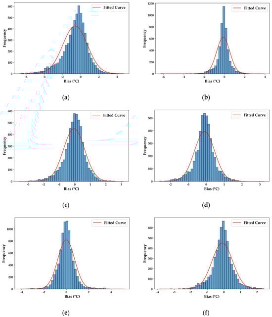 Histogram of bias distribution: (a) is the result after the fusion of VIRR and MWRI data; (b) is the OISST reference data for 15 July 2019, corresponding to VIRR and MWRI data; (c) is the result after the fusion of AVHRR and AMSR data; (d) is the OISST reference data for 15 October 2023, corresponding to AVHRR and AMSR data; (e) is the result after the fusion of MODIS and AMSR data; and (f) is the OISST reference data for 6 September 2024, corresponding to MODIS and AMSR data. Each blue bar in the histograms represents the frequency of biases within a specific interval, while the red line denotes the fitted normal distribution curve. The x-axis indicates the bias values, whereas the y-axis represents their frequency.