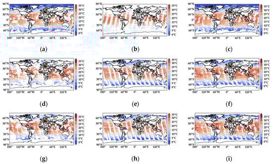 SST distribution of raw satellite data and fused results: (a) is the VIRR satellite data; (b) is the MWRI satellite data; (c) is the result of fusing the VIRR and MWRI data; (d) is the AVHRR satellite data; (e) is the AMSR satellite data from 15 October 2023; (f) is the result of fusing the AVHRR and AMSR data; (g) is the MODIS satellite data; (h) is the AMSR satellite data from 6 September 2024; and (i) is the result of fusing the MODIS and AMSR data.