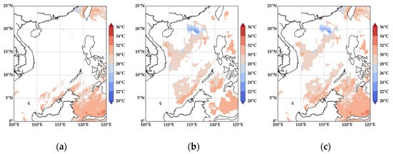 SST distribution of infrared and microwave SST data and fused SST data in the South China Sea region: (a) is the infrared SST data, (b) is the microwave SST data and (c) is the fused SST data.