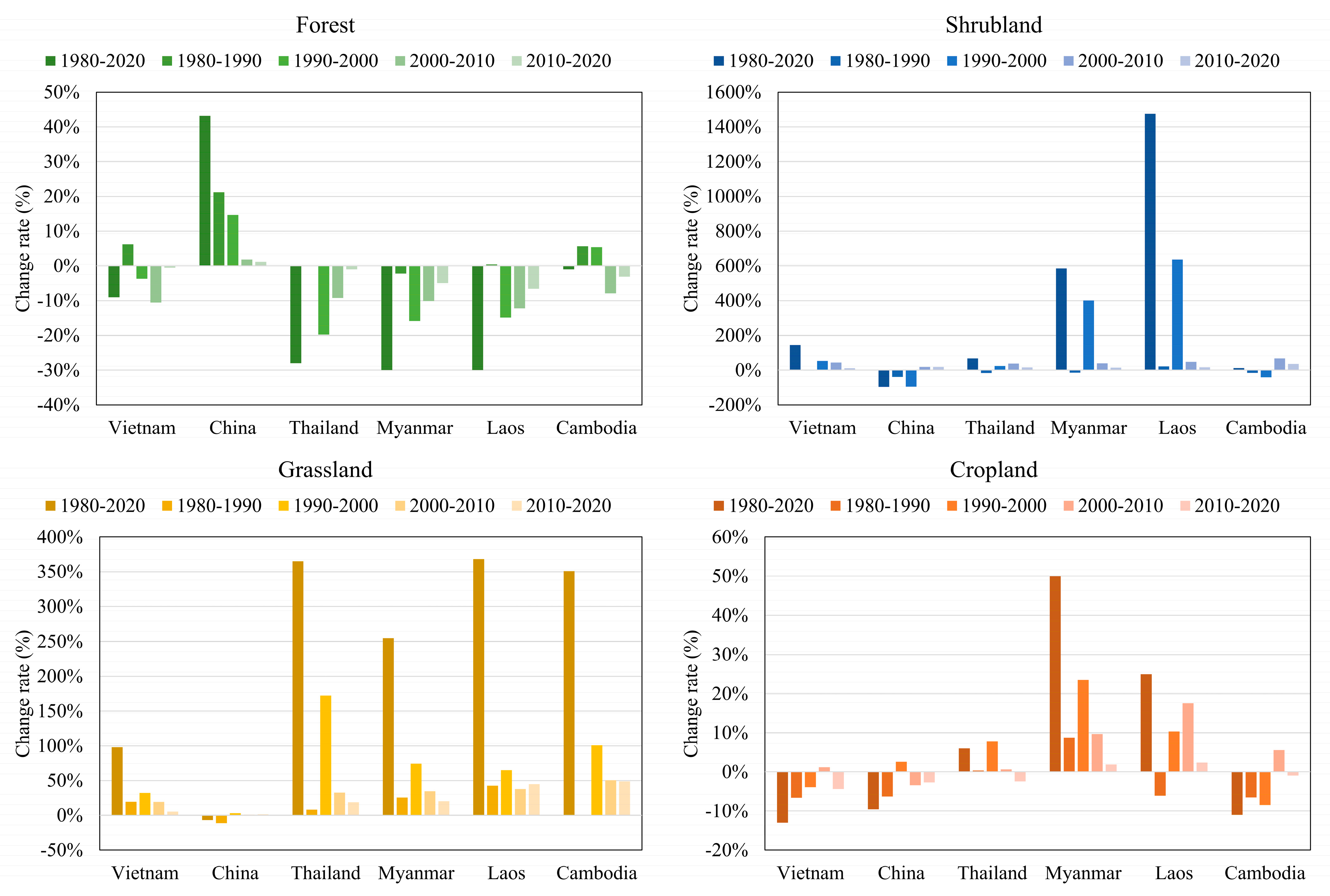 - Zhai, J.; Xiao, C.; Feng, Z.; Liu, Y. Spatio-Temporal Patterns of Land-Use Changes and Conflicts between Cropland and Forest in the Mekong River Basin during 1990–2020. Land 2022, 11, 927. [Google Scholar] [CrossRef]