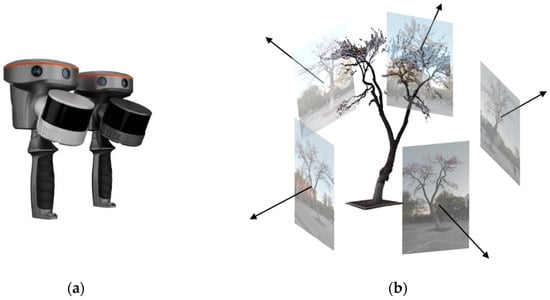 We use a handheld laser scanner, CHCNAV RS10 (Shanghai CHCNAV, China), to collect LiDAR point cloud data, and use an HONOR GT90 phone (HONOR, China) camera to obtain image data. The point cloud data are obtained through SmartGo data collection and CoPre data calculation. The point cloud data and image data are collected from the initial position in a clockwise direction, with the roots of the landscape tree as the center, and collected from a 360° perspective. The heights of the equipment are all set to 1.5 m above the ground, and the distance is adaptively adjusted according to the size of the landscape tree and the surrounding conditions. The collection equipment and method are shown in