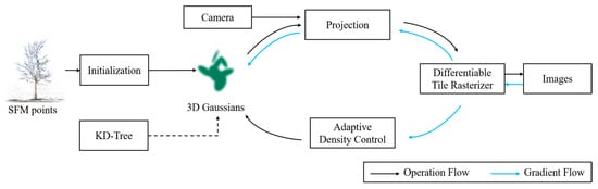 37] to train/test the dataset, with testing conducted every 8 photos. During the training process, the order of the spherical harmonic function is increased every 1000 iterations to gradually improve the model’s expressive power. The learning rate of each parameter is dynamically adjusted using the adaptive learning rate in the Adam optimizer to gradually converge the loss function. Meanwhile, to avoid an unreasonable increase in Gaussian distribution, the opacity parameter is reset every 1000 iterations.