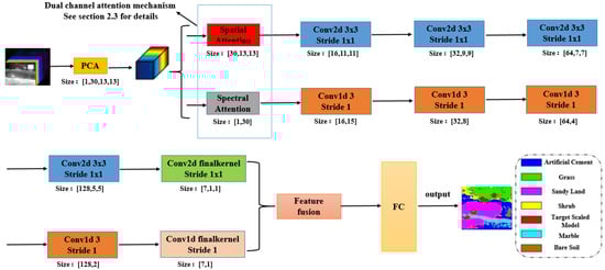The DACNet network architecture comprises three fundamental components: (1) a Principal Component Analysis (PCA) module for dimensionality reduction, (2) dedicated 1D and 2D convolution units for independent spectral and spatial feature extraction, respectively, and (3) an integrated dual-channel attention mechanism embedded within both convolutional pathways. The operational workflow of DACNet proceeds in the following sequence: