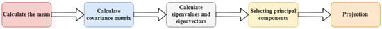 Hyperspectral images contain a large amount of spectral and spatial information, which not only increases computational complexity and storage costs but may also lead to the “curse of dimensionality”, making data analysis more challenging. Principal Component Analysis (PCA) is a commonly used dimensionality reduction technique that projects correlated high-dimensional datasets onto a new lower-dimensional coordinate space, facilitating a better understanding of the data structure and extraction of key features. The fundamental idea of PCA is to transform multiple variables in the data into a set of new orthogonal vectors through a linear transformation. These combined variables, known as principal components, have maximum variance and are uncorrelated with each other. The workflow of PCA is illustrated in Figure 2.