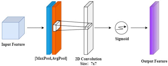 - Stack the two pooled feature maps in the channel dimension with a size of . Subsequently, the convolutional layers with kernel sizes of (7,7) are used to perform operations, fuse channel information, and reduce the size of the feature map from to .
