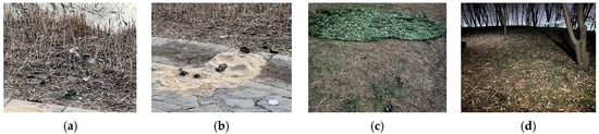 Layout of targets against different ground backgrounds. (a) Shrubs, grassland, and bare soil background. (b) Sandy, cement, grassland, and bare soil background. (c) Grassland and camouflage net background. (d) Forest and grassland background.